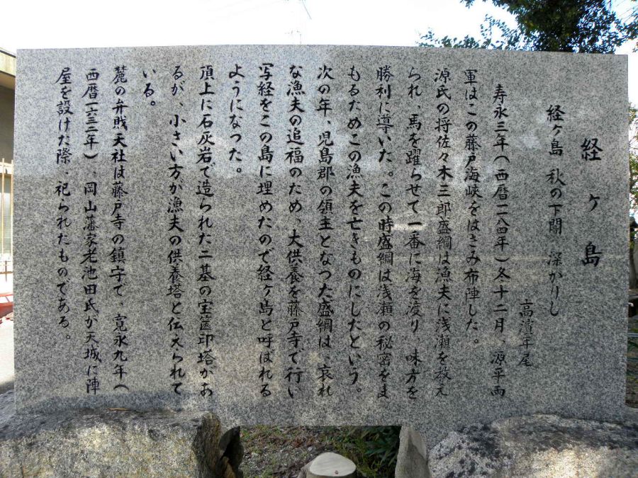 先陣の功を立てた恩賞で児島の領主となった盛綱は、戦没した将兵と口封じに亡き者にした漁夫の追福のために、藤戸寺で大法要を営み、写経を当時藤戸寺の離れ境内であった海中の小島に埋めたといわれ、そのことからそこが経ヶ島と呼ばれるようになったといわれます。