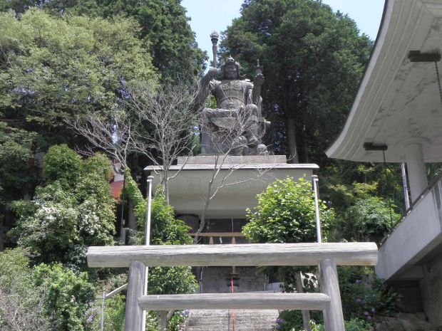 安養寺は、高野山真言宗の寺ですが神仏習合の寺であるため鳥居があり、参道の石段(中腹あたり)の楼門上に巨大な毘沙門天像があります。