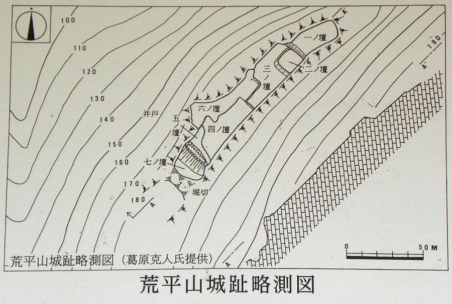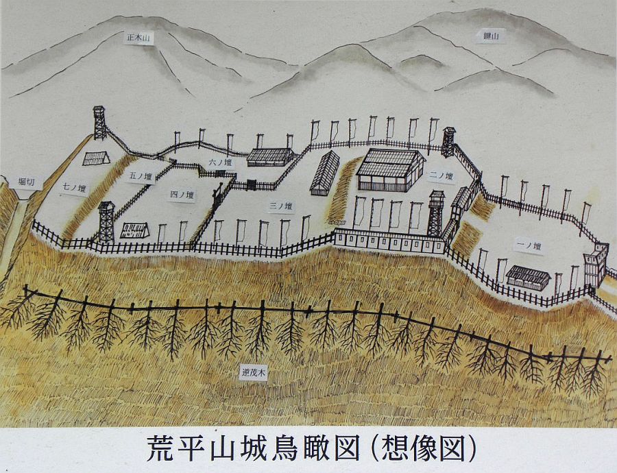 東屋に設置してある説明板に、荒平山城の鳥瞰図(想像図)も載っていました。
